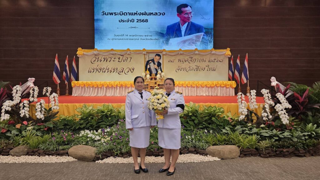 On 14 November 2025, Mrs. Sucharee Picha, Director of the Office of Agricultural Economics Region 1 (ROAE 1), assigned OAE ROAE 1 staff to participate in the fresh flower offering ceremony on the occasion of Father of Royal Rainmaking Day 2025. The ceremony was presided over by Mr. Chatchawan Panya, Deputy Governor of Chiang Mai Province, at Ratchaphruek Hall, Exhibition Building 1, Royal Park Rajapruek, Mae Hia Subdistrict, Mueang Chiang Mai District, Chiang Mai Province.