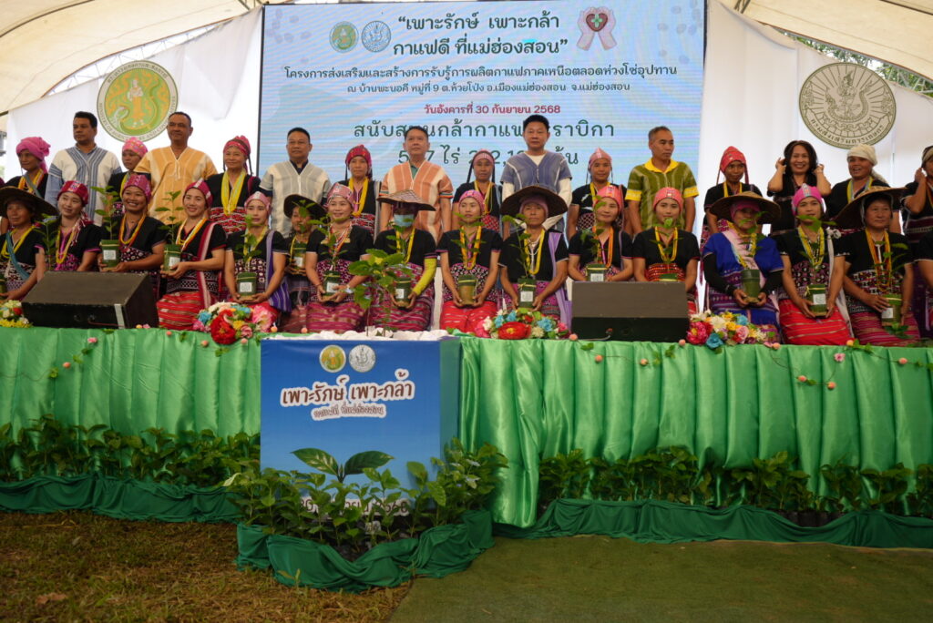 วันที่ 30 กันยายน 2568 นางสุจารีย์ พิชา ผู้อำนวยการสำนักงานเศรษฐกิจการเกษตรที่ 1 มอบหมายให้เจ้าหน้าที่ส่วนสารสนเทศการเกษตร เข้าร่วมงานโครงการส่งเสริมและสร้างการรับรู้การผลิตกาแฟภาคเหนือตลอดห่วงโซ่อุปทาน “เพาะรักษ์ เพาะกล้า กาแฟดี ที่แม่ฮ่องสอน” ซึ่งภายในงานมีวัตถุประสงค์เพื่อสร้างการรับรู้และประชาสัมพันธ์ให้เกษตรกรใช้กาแฟพันธุ์ดี ในการผลิตกาแฟคุณภาพ สร้างอาชีพ สร้างรายได้ที่ยั่งยืน เพิ่มพื้นที่สีเขียว ส่งเสริมให้เกษตรกรมีความรู้ ทักษะ สามารถใช้เทคโนโลยีนวัตกรรมในการเพิ่มประสิทธิภาพการผลิตกาแฟคุณภาพ สามารถบริหารจัดการพัฒนากาแฟ ตลอดห่วงโซ่อุปทานได้ และส่งเสริมการขยายพื้นที่ปลูกกาแฟอาราบิก้า ในพื้นที่จังหวัดแม่ฮ่องสอน ให้สอดคล้องกับแผนพัฒนาจังหวัด ตามความต้องการของเกษตรกร และตลาดในอนาคต โดยมีนายสุริยะ คำปวง รองอธิบดีกรมส่งเสริมการเกษตร เป็นประธานในพิธีเปิด และว่าที่พันตรียุทธนา เจ้าดูรี นายอำเภอเมืองแม่ฮ่องสอน เป็นผู้กล่าวต้อนรับ และ นายพยุงศักดิ์ สิทธิลภ เกษตรจังหวัดแม่ฮ่องสอน เป็นผู้กล่าวรายงาน ทั้งนี้มีหัวหน้าส่วนราชการหน่วยงานอื่นๆที่เกี่ยวข้อง ได้เข้าร่วมงานดังกล่าว ณ แปลงกาแฟของนายสมศักดิ์ หม่าหล่ากูล บ้านพะนอคี หมู่ที่ 9 ตำบลห้วยโป่ง อำเภอเมือง จังหวัดแม่ฮ่องสอน